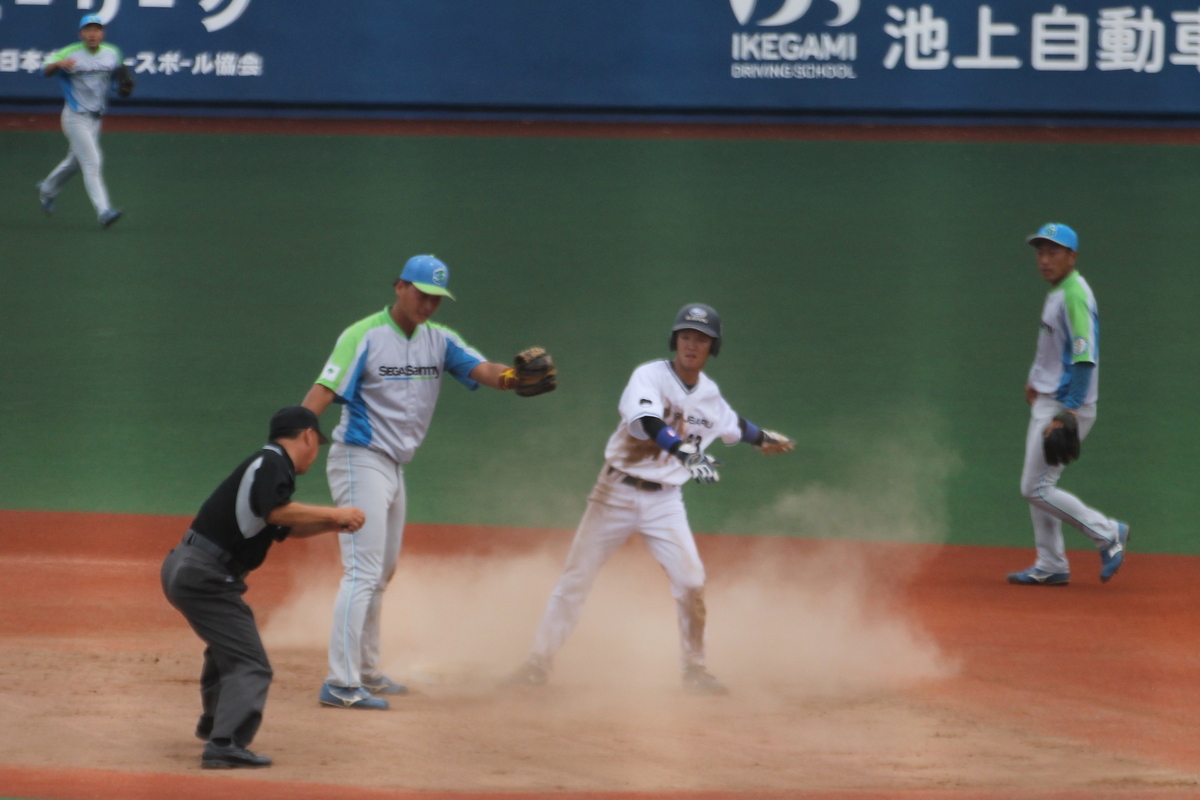 ここで予選やJABA大会でも多く見せた機動力を駆使して畳みかけたい日本通運ですが、稲垣選手の盗塁は失敗。