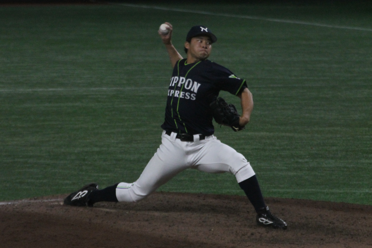 150km/hに達する速球をテンポよくコーナーに投げ分けて凡打の山を築き上げ、今大会2試合で凡退がなかった北川選手を筆頭に全体的に好調だった日本通運打線が嘘のように全く手出し出来ない状態にありました。